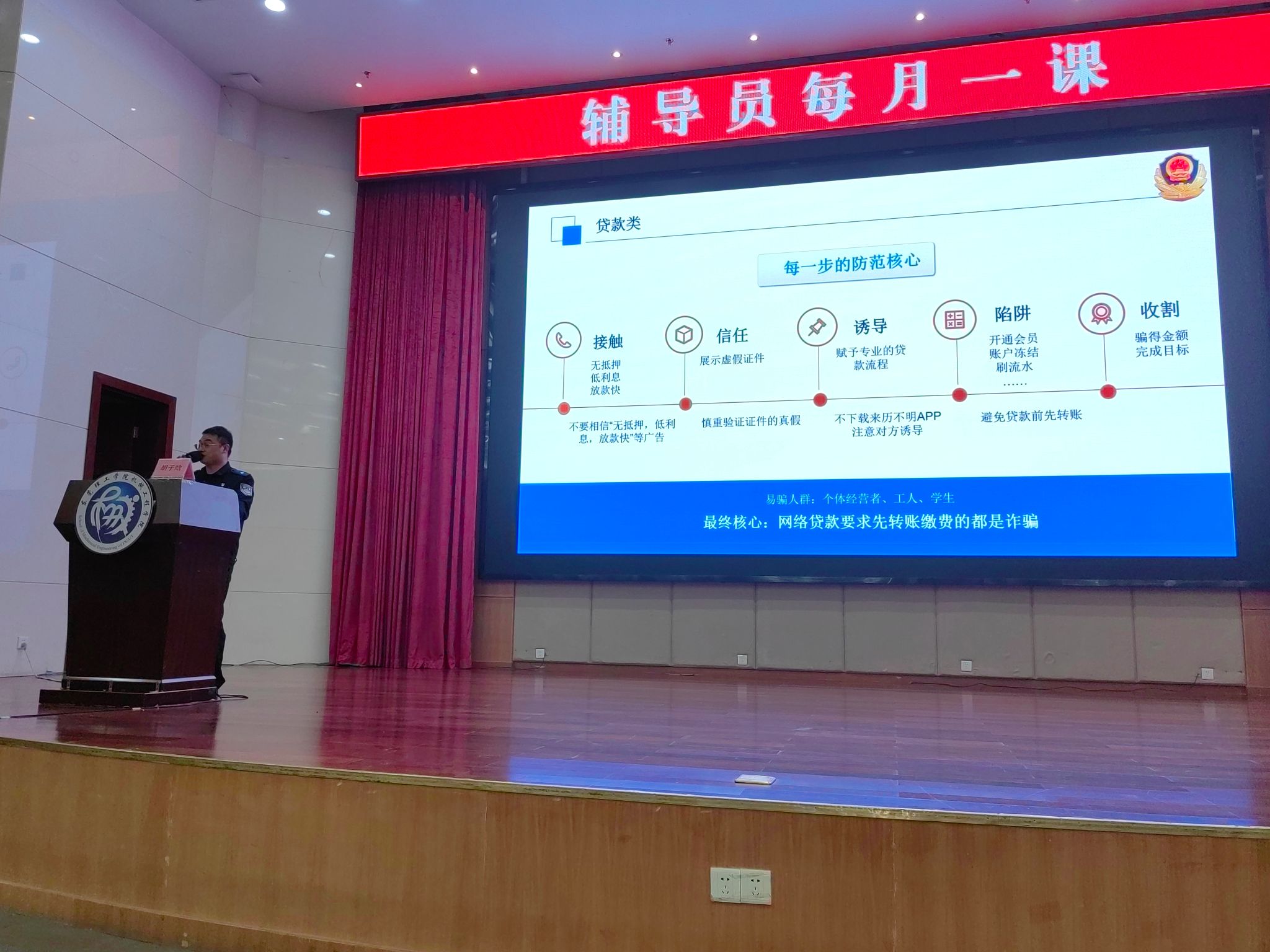 会后,松山湖红棉派出所胡子晗警官为公司师生开展校园反诈宣传活动,针对几种在员工中频发的骗局,并就近期发生的案例进行分析和披露,切实增强同学们在生活中对诈骗现象灵活应对的防范意识。