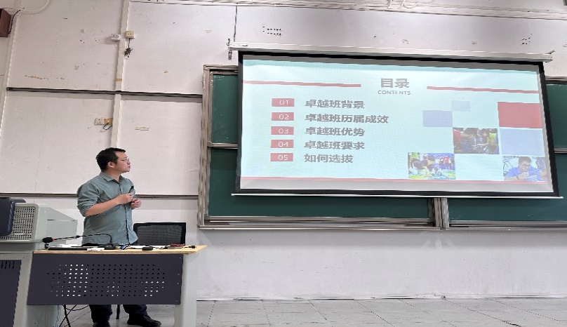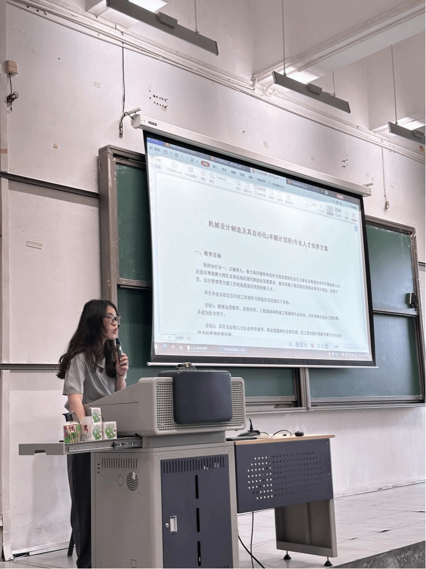 会上,张玉勋老师为了更好帮助2023级机械设计制造及其自动化专业员工深入了解机械卓越班的培养模式与优势,详细介绍了机械卓越班的“3+1”培养模式,即3年校内学习加1年企业实践,强调该模式注重理论与实践结合,由高校与企业联合培养,旨在提升员工的工程实践能力和就业竞争力。他通过往届数据对比分析和往届师兄师姐成果展示,分析了卓越班员工在专业技能、证书获取(如额外工程团队格证书)及就业前景等方面的优势,并解读了卓越班独立的培养方案与目标产出。