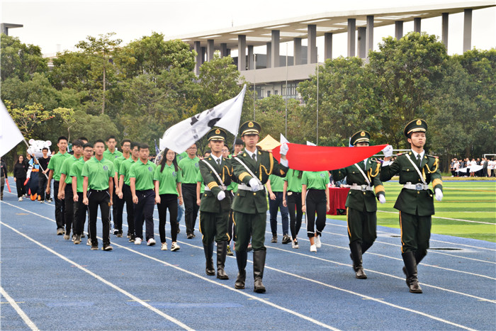 开幕式伊始,主持人介绍列席嘉宾,分别是副经理黄辉宇,党总支副书记陈举铭,团总支书记、辅导员肖毅,辅导员黄楚刁,辅导员陈凤宜,辅导员罗嘉楠,武静老师。紧接着,国旗护卫队踏着整齐的正步,举着国旗庄严进场。而后,青马班方阵、团学方阵、各班级代表方阵陆续进场,整齐的步伐、各具特色的旗帜与服装、气势雄壮的口号,彰显出了伟德国际1946bv官网的风采。方阵归位后,全体人员奏唱国歌。接下来,TNT协会带来了精彩的舞蹈表演,而由团学和青马班代表方阵合唱的歌曲“我相信”更是点燃了全场人员的热情。随后,陈书记致开幕词。陈书记强调同学们要发挥“友谊第一,比赛第二”的精神,希望选手们尊重裁判和其他选手,发挥顽强拼搏的精神。最后,运动员代表和裁判代表分别进行宣誓,黄经理宣布运动会正式开始。
