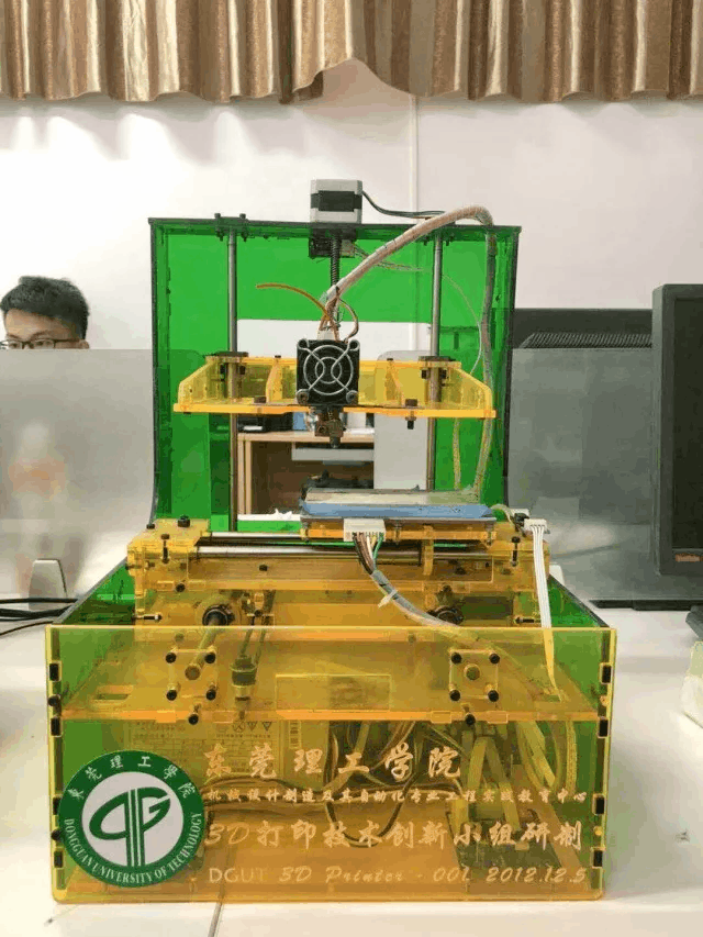 3D打印创新实验室里的桌面式FDM 3D打印机是首届机械卓越班员工的杰作,诞生日期是2012年12月5日,获得过挑战杯科技竞赛国赛二等奖(目前公司最好成绩)省赛特等奖,3D打印创新实验室的员工还拿它参加挑战杯创业竞赛获国赛三等奖,因为它,有实验室的员工获得过杨振宁奖学金,莞工之星。3D打印创新实验室的指导老师们获得过公司突出贡献奖;它在实验室接待过教育部副部长、市委书记、还有各级领导,还有中小员工。