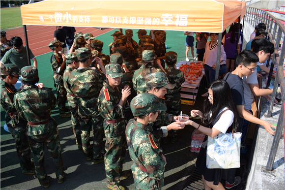 烈日炎炎,逼人的热气从地面涌起,包围着每一个人。军训的紧迫度因此再次提高。在军训最艰忍难耐的第六天,9月17日,伟德国际1946bv官网团总支、员工会给新生送来了清凉。