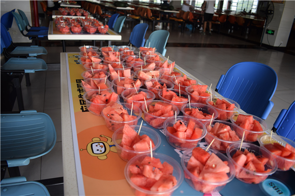 团学干部从前期采购到后期工作处处用心。中午将至,红豆糖水已经被煮好并放置在系办公室,待放凉后发放。同时,干部分成两批分别在第一饭食堂和真草运动场进行西瓜的切块,同时把切好的西瓜块放入塑料碗中以便食用。