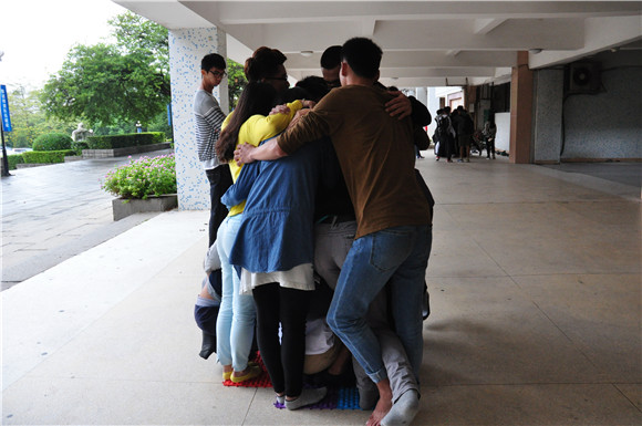 下午,培训以团体形式进行。通过众干事的投票选出队长后,队伍在图书馆后面的空地进行坐人椅。但又因天气原因,在活动刚开始不久,场地转为舞蹈室。在队长的指挥下,干事们围成圆形并坐下。然而培训并没有那么简单,在坚持不到一分钟挑战就失败了。不断地调整,队长的独自受罚,挑战时的痛苦,让新干事们慢慢明白什么是团队。最后,因为时间原因,挑战还是没用成功,纵然失败,相信干事们收获的比成功还要多。