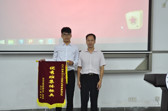 大会尾声,主持人宣布本次大会的获奖班级,陈举铭老师、李钰田老师分别为优秀班集体标兵和优秀班集体的获奖班级颁奖并合影留念。(陈世森/文 黄锦彦/图)