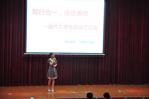 何为“知行合一",并且要怎样才能做到“技行天下”呢?陈慧芬女士在演讲中结合自身经验和引用经典名人事例向同学们进行了一番深刻的阐述。陈老师借用“即知即行是英才,不知而行是庸才,知而不行是蠢材,不知不行不成才”的经典名言简明地解释了“知行合一”,并且站在用人单位的角度上提出了三个让同学们终身受用的词——“梦想”、“激情”、“行动”,循循引导同学们达到“技行天下”。最后陈老师以哈佛校训结束了讲话,意在希望同学们在灿烂的年华岁月里放手拼搏,那么将来的你一定会感激现在拼命的自己。