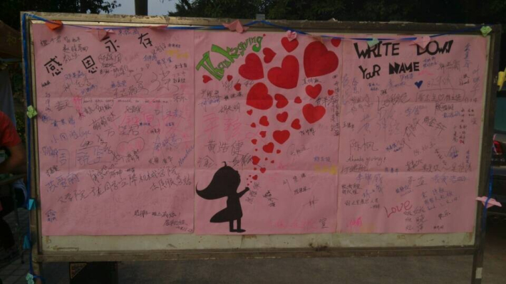 虽然现在正处东莞燥热的冬季,但是志愿者的工作热情却丝毫没有冷却。中午,待到志愿者完成活动准备工作,感恩节活动正式开始。待到下午,越来越多同学路过活动地点,因为是下课时间,路过的同学比较多,大家都有空余的时间参与这次写祝福语的活动。渐渐地,那些悬挂在活动营地周围的“爱心祝愿”变得丰盈起来,给此次活动点缀不少。临近傍晚,志愿服务站的人员在写满同学名字的展板前合照留念之后,此次感恩节活动正式圆满结束。
