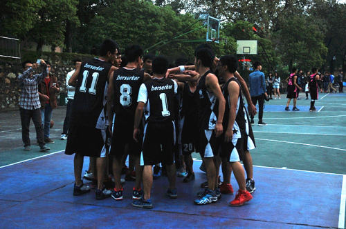当裁判员吹响第一声哨响,半决赛正式开始。双方队员迅速进入状态,高度集中注意力,队员之间的配合十分默契。他们默契地完成传球,尽自己最大努力断球、防守,进攻。球员们轻轻一跃,进球得分,啦啦队及观众不断鼓掌喝彩。
