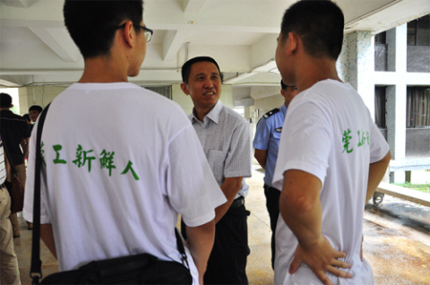在松山湖校区,由于机械设计制造及其自动化(卓越班)的新生将在松山湖开始他们的老员工活,团总支、员工会也安排了人员进行迎接。公司领导党总支书记钟守炎、思想政治辅导员黄楚刁到达现场与新生及家长交流。