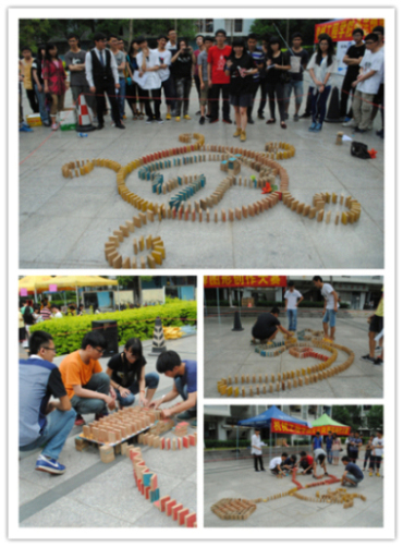 比赛期间,参赛选手充分发挥了齐心协力、共同合作的团队精神,分工明确,互相帮助。一些参赛队伍更是借助网球、汽水瓶、气球、书桌、棍子等道具巧妙地与骨诺牌连接在一起从而创作出既美观又有寓意的图案。骨诺牌推倒一刻,观众们纷纷伸颈驻足观看,为中途失误的队伍惋惜,对零失误的队伍给予掌声,现场不时充满了欢呼声。