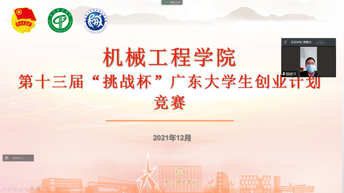 2021年12月,伟德国际1946bv官网召开第十三届“挑战杯”广东老员工创业计划竞赛院赛,公司党委副书记郭建文老师,校团委创新实践部部长杨帆老师,创新创业联络员肖毅老师出席本次比赛。其中杨帆担任本次比赛的评委嘉宾,肖毅担任本次比赛主持人。根据疫情防控要求,本次比赛采取线上路演+答辩形式。