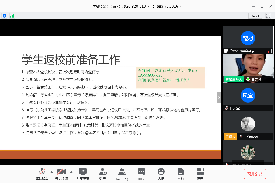 会上,黄楚刁老师传达了公司《bevictor1946韦德官网员工返校指引》文件精神及要求,强调员工返校前、返校当天、在校期间及离校前后各项工作内容与注意事项。提醒同学们按照公司要求按批次安全返校,提前做好“粤康码”、健康日报表打卡、疫情安全防护、《致毕业生家长的一封信》等工作。返校当天按公司要求有序进入公司,到校后严格执行“五个一律”要求,不串门、不聚集,每天自觉配合做好体温检测和身体健康报告,遵守社区、食堂、实验室、活动场所、个人健康的相关制度与管理,时刻做好个人防护工作。