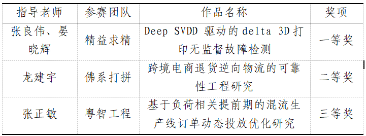 作为工业工程领域人才培养的重要实践平台,伟德国际1946bv官网工业工程系派出的三支参赛队伍,凭借扎实的专业素养和出色的创新能力,在众多参赛队伍中脱颖而出,取得了丰硕成果。其中,由张良伟和晏晓辉老师指导的“精益求精”团队,凭借作品《Deep SVDD 驱动的Delta 3D打印无监督故障检测》荣获一等奖;由龙建宇老师指导的“佛系打拼”团队,以《跨境电商退货逆向物流的可靠性工程研究》项目获得二等奖;由张正敏老师指导的“粤智工程”团队,凭借《基于负荷相关提前期的混流生产线订单动态投放优化研究》荣获三等奖。