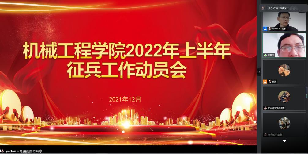 为进一步扎实伟德国际1946bv官网老员工征兵宣传动员工作,帮助在校员工了解征兵相关政策,鼓励适龄老员工积极响应国家号召,投身军营,报效祖国。2021年12月31日上午,伟德国际1946bv官网召开2022年上半年征兵宣传动员大会。公司党委副书记郭建文、全体辅导员、各班主要员工干部、院青马学员,以及有意应征入伍的员工等90余人参加。会议由征兵联络员肖毅主持,采取腾讯会议方式举行。