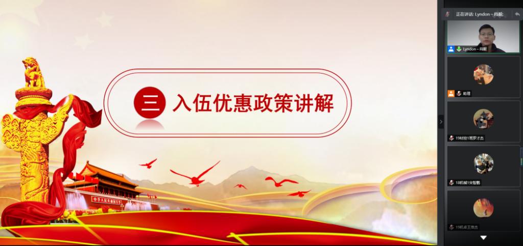 随后,辅导员肖毅就应征入伍优惠政策等进行动员,包括学业、经济、就业入党等方面的入伍优惠政策鼓励。同时,肖毅指出在党的十八大以来,我们国家对于军队的改革也做了很多调整,现在征兵是一年两征,各位同学应该积极响应号召。在会议最后,肖毅介绍了今年应征入伍的报名流程,同时还设置了线上答疑环节。