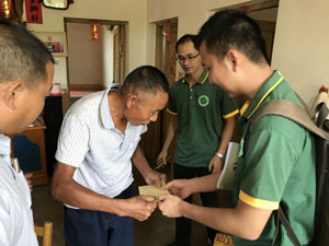 2017年9月16日-18日,公司教职工蔡盛腾、陈海彬、何伟锋等人前往韶关乐昌市黄圃镇应山村进行扶贫慰问工作。在此期间,应山村两位村干部陪同前往该村7户低保户家庭进行逐家走访慰问,并详细地了解他们每户的家庭情况,并致以节日的问候,同时每户送上大米、食用油、面、月饼等慰问礼品及慰问金。