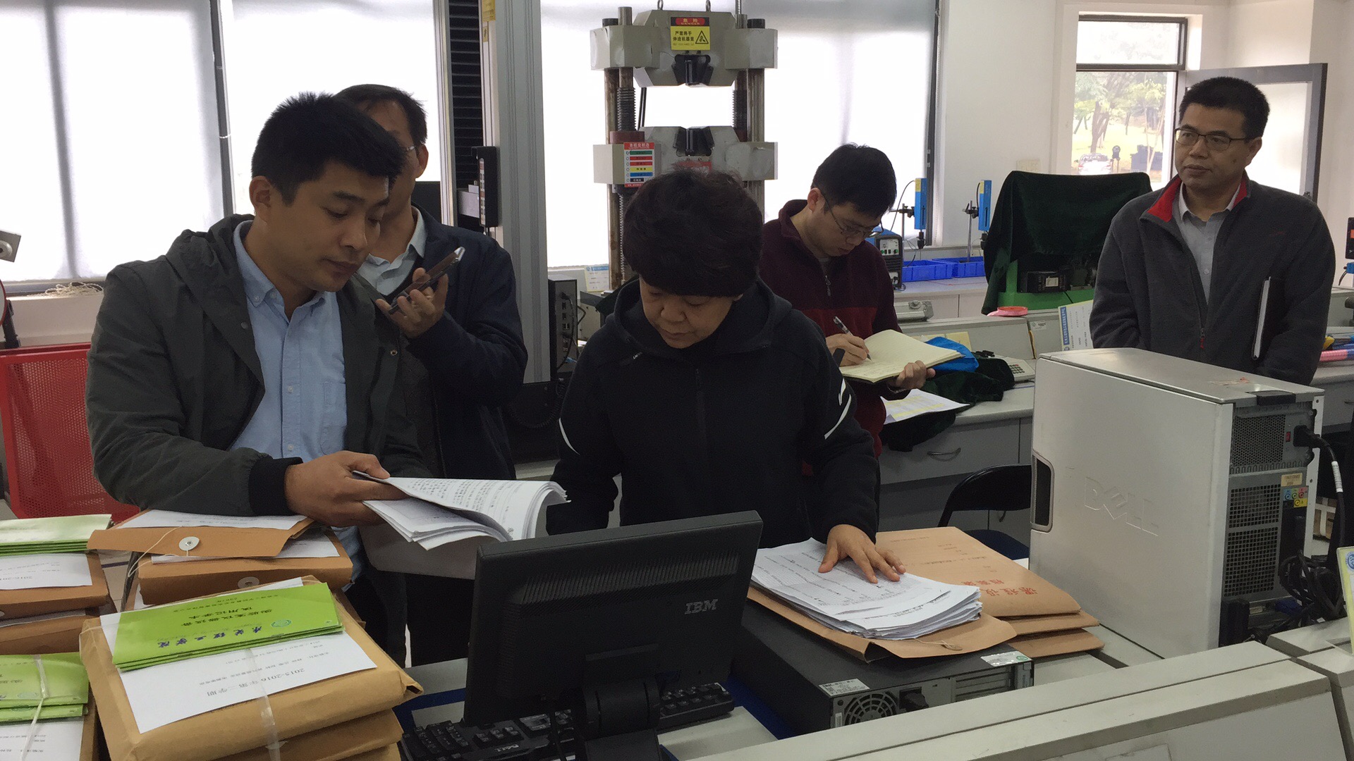 教务处工作人员在工程力学实验室仔细查阅实验报告
