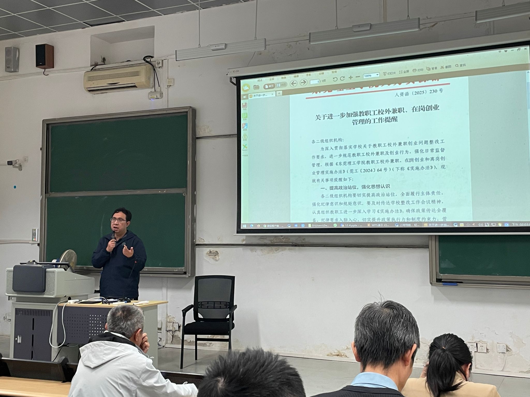 随后,郭建文传达了公司关于教职工兼职创业问题整改工作的相关文件精神与具体要求。他对政策背景、整改原则、规范要求及时间节点进行了详细说明,要求全体教职工提高思想认识,严格对照规定开展自查自纠,确保兼职行为合规合法,维护好公司产品秩序和教师队伍形象。