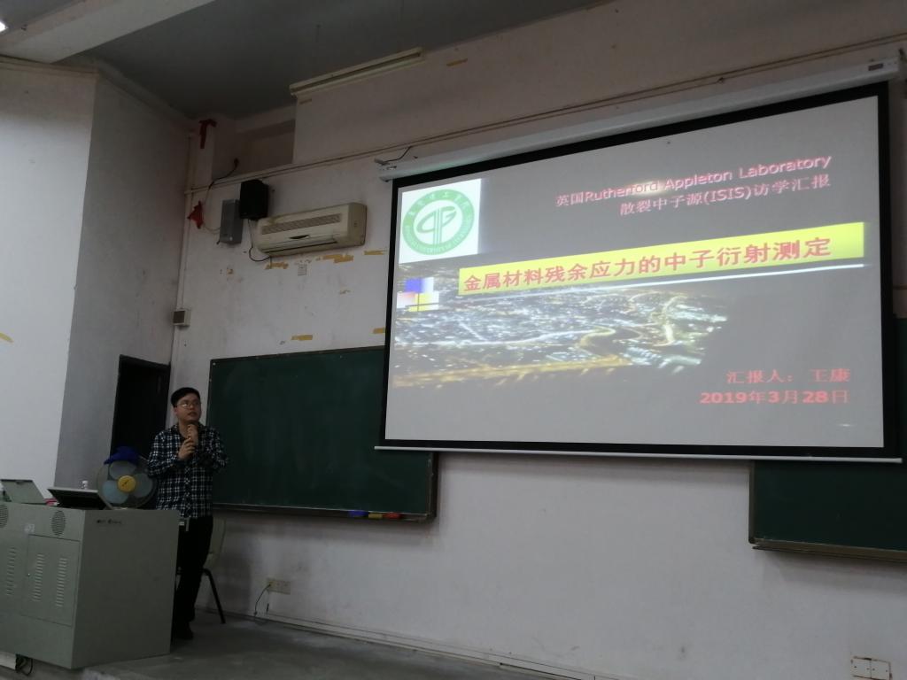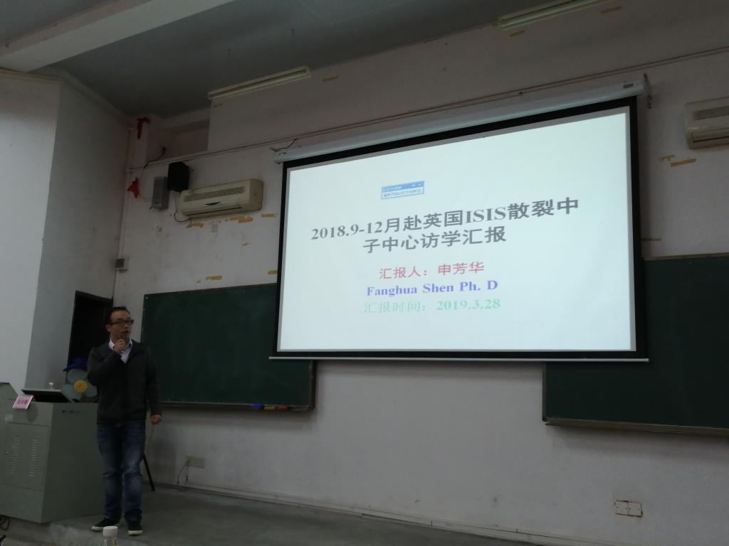 2019年3月28日,伟德国际1946bv官网首批赴英国散裂中子(ISIS)访学青年老师申芳华、王康、海洋、博士在教学楼6B-102进行了访学成果汇报。院领导孙振忠、钟守炎、黄辉宇、郭建文、陈举铭和公司全体教职工出席报告会。