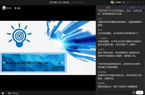 班会前,各班同学通过线上问卷调查、小组讨论等形式深入展开讨论。各班采用线上会议形式开展班会。会上,全体员工深入学习领会《成洪波通知在“落实‘三全育人’建设一流本科”公司产品大讨论动员部署会上的讲话》讲话精神与《bevictor1946韦德官网“三全育人”综合改革建设方案》文件要求。随后,员工从本校公司产品情况及自身经历出发,结合公司产品大讨论的四个重点任务,就针对课程质量、青年团队力量、专业建设、员工技能培养、教学方式、校园文化、心理教育、诚信教育等公司产品内容,深入探讨公司产品中存在的问题,并提出有效的建议。