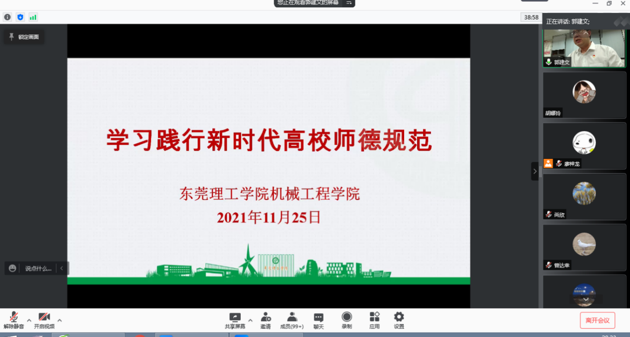 会议还开展了“践行新时代高校师德规范”的学习。郭建文领学了习近平总书记关于师德师风的重要论述,宣传解读了《新时代高校教师职业行为十项准则》等文件精神,通过讲述高校系统师德失范典型案例和校内师德失范警示案例,用真实的案例给全体教师提出警示,让教师们深刻的领悟到师德的真谛,引导教职工绷紧师德底线约束之弦。