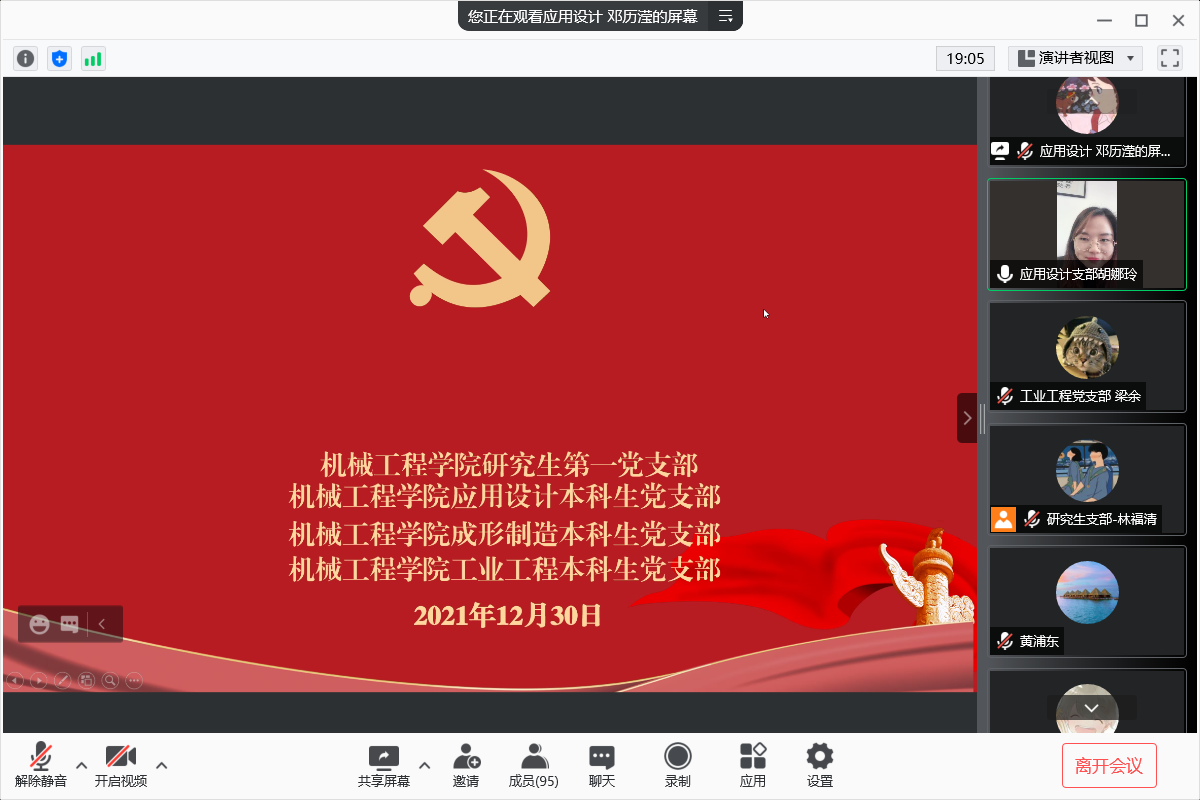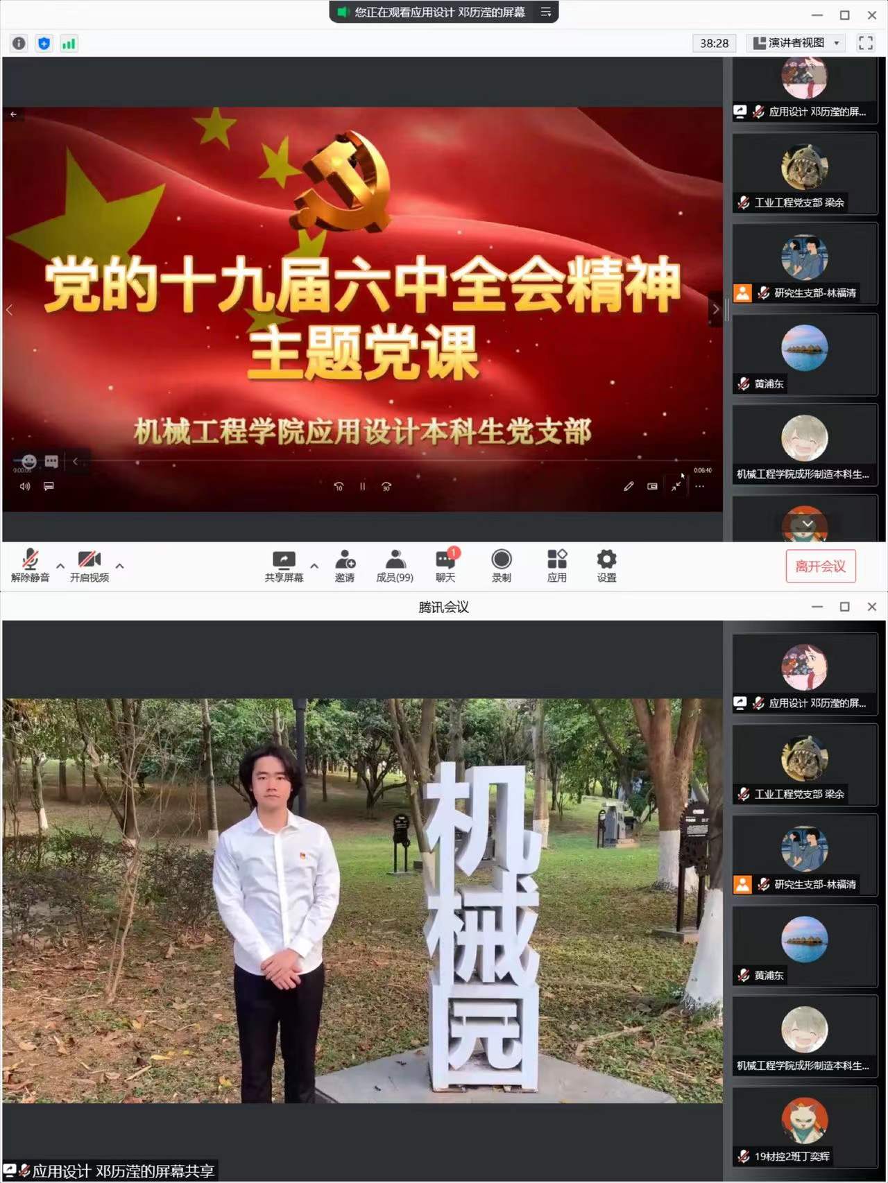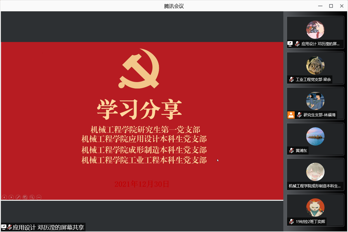 曾达幸同志对《中共中央关于党的百年奋斗重大成就和历史经验的决议》中的夺取新民主主义革命伟大胜利、完成社会主义革命和推进社会主义建设、进行改革开放和社会主义现代化建设、开创中国特色社会主义新时代、历史性成就和历史性变革、中国共产党百年奋斗的历史意义及历史经验等六个方面向同志们深刻阐释了十九届六中全会精神,并表示全体党员同志要坚持唯物史观和正确党史观,总结党的百年奋斗重大成就和历史经验,学习党的百年奋斗所取得的伟大成就。并带领全体党员同志观看成形制造本科生党支部、应用设计本科生党支部制作的微党课视频。