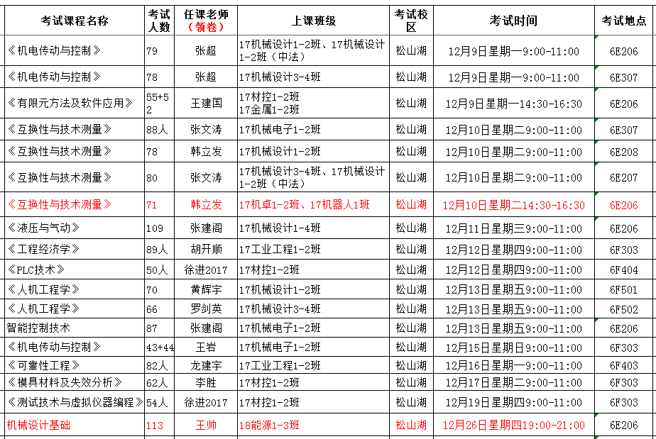 机械工程院安排的考试如无特别说明,补修、跟班重修的员工按跟班班级就坐考试