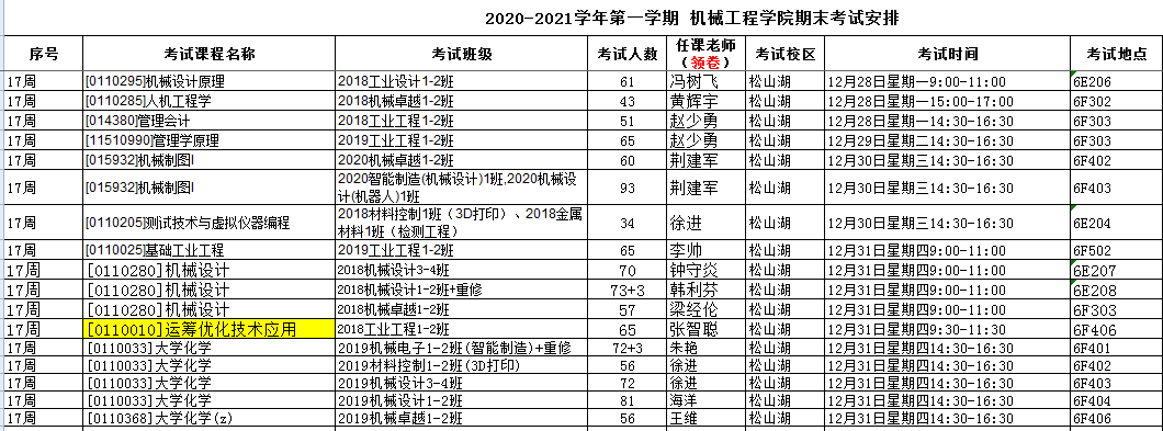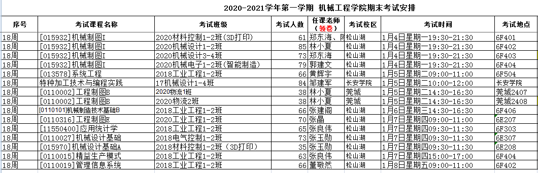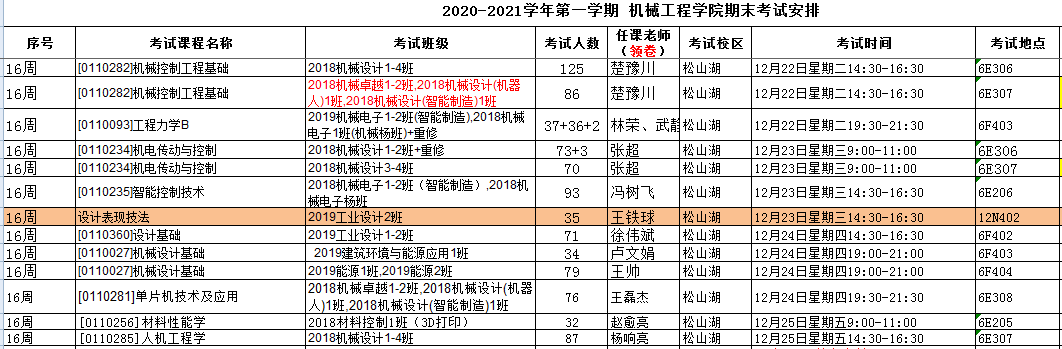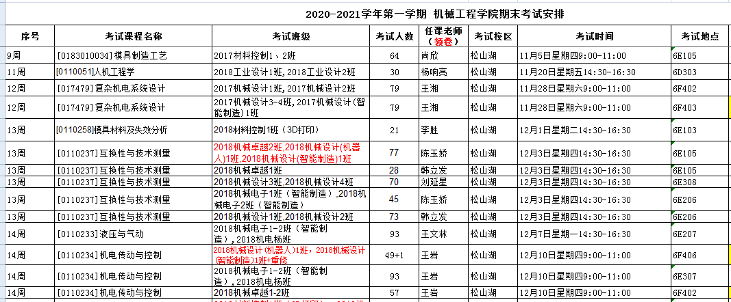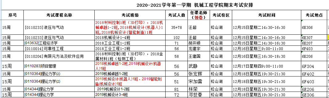 机械工程院安排的考试如无特别说明,补修、跟班重修的员工按跟班班级就坐考试