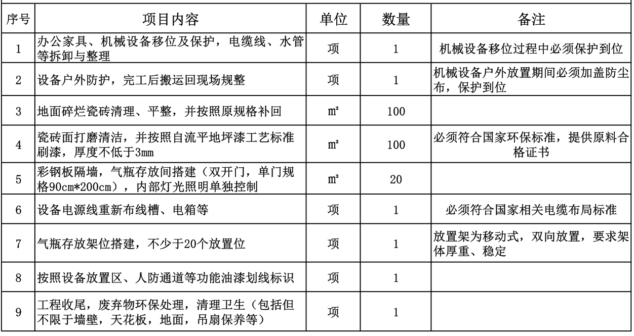 1、 项目概况:12B104房间改造内容主要包括:(1)影响到施工的所有物品,包括但不限于办公家具、机械设备、材料等移位及保护,相关电缆、水管线路等拆卸等;(2)碎烂地面清理、平整修复以及瓷砖补回,瓷砖面打磨并按照环氧自流平地坪漆工艺标准刷漆厚度不低于3mm(环保标准必须符合国家相关要求);(3)房间隔断搭建气体钢瓶存放间(搭建高度以房间天花板为准)并配备不少于20个钢瓶固定架;(4)三相电路改造,电缆、水管等线路重新布局与整理,根据设备位配置电箱位,设备归位,采用油漆划线对设备放置区、人防通道等功能分区进行标识;(5)工程收尾、废弃物处理、照明灯更换以及卫生清洁(包括但不限于地面、墙壁、天花板、吊扇保养与清洁等);
