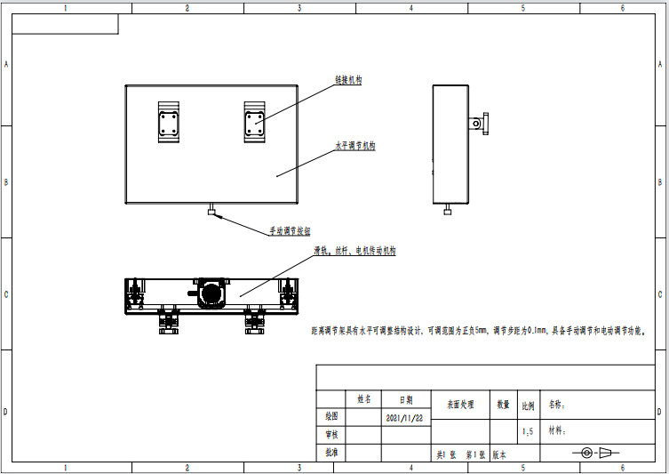 距离调节架具有水平可调整结构设计,可调范围为正负5mm,调节步距为0.1mm,具备手动调节和电动调节功能。 |