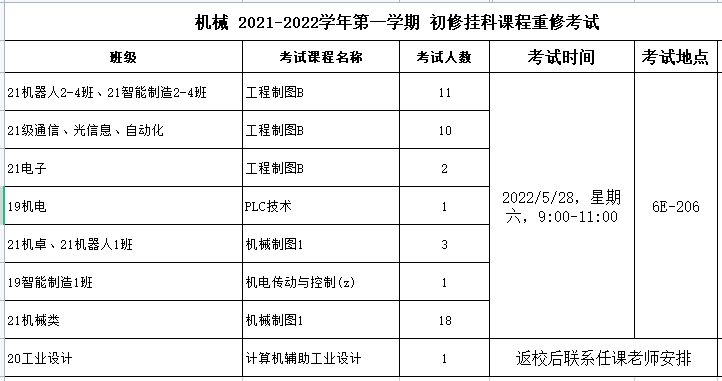 期末考试安排 (2021-2022学年第二学期机械工公司开课课程)