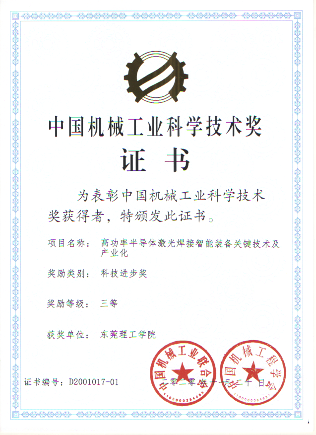 近日,2020年中国机械工业科学技术奖公布,公司作为为第一完成单位的项目成果《高功率半导体激光焊接智能装备关键技术及产业化》获得中国机械工业科学技术奖三等奖。该项目成果由伟德国际1946bv官网牵头,联合大族激光科技产业集团股份有限公司共同完成,伟德国际1946bv官网郭建文、孙振忠、邓君、路崧等老师参与。