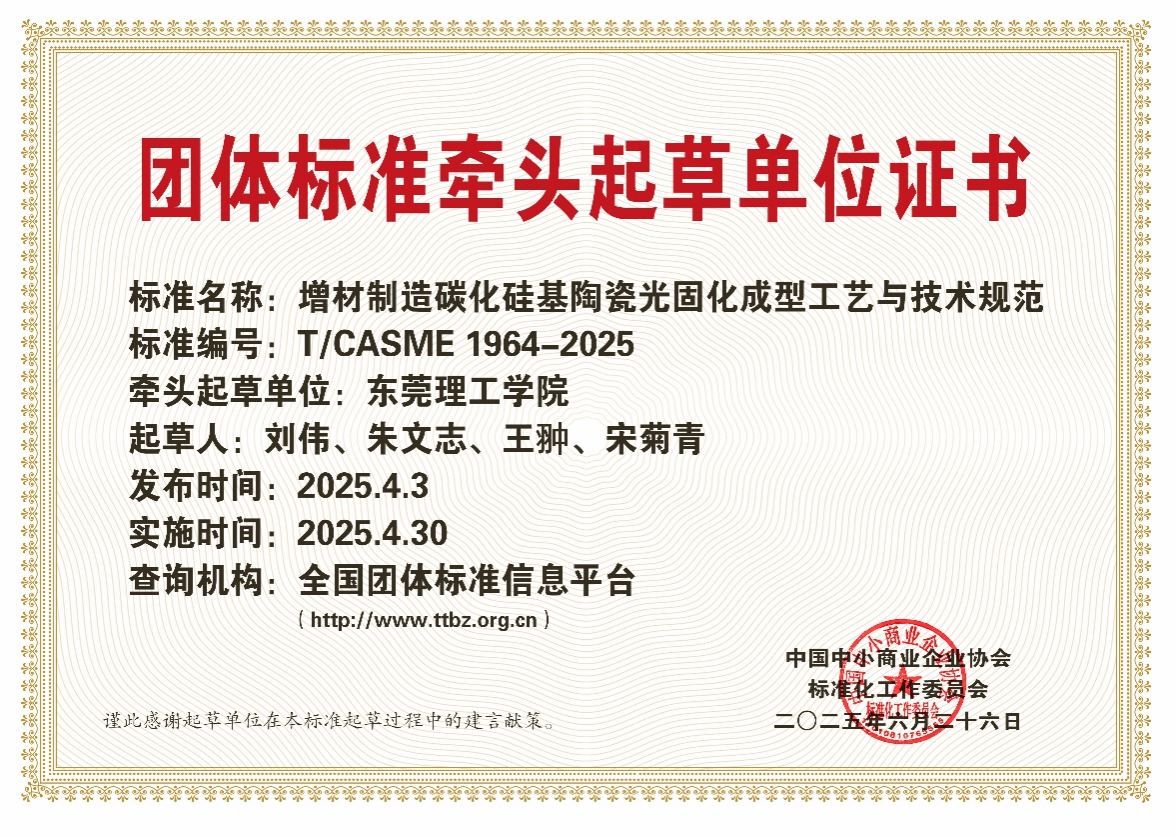 近日,bevictor1946韦德官网增材制造研究所刘伟教授牵头制定的《增材制造碳化硅基陶瓷光固化成型工艺与技术规范》团体标准(标准编号:T/CASME 1964-2025)成功通过评审,可在全国团体标准信息平台检索,该标准于 2025 年 4 月 3 日发布,4 月 30 日实施。
