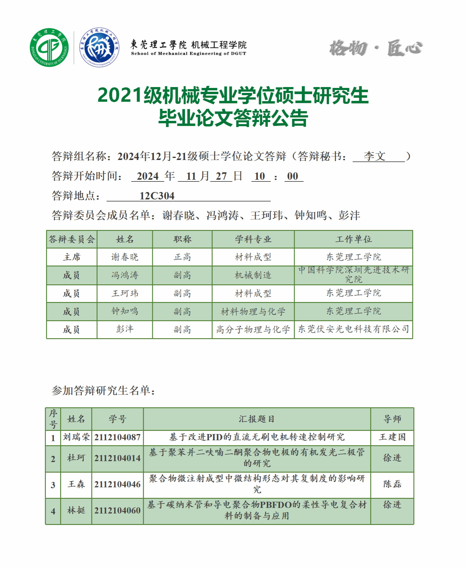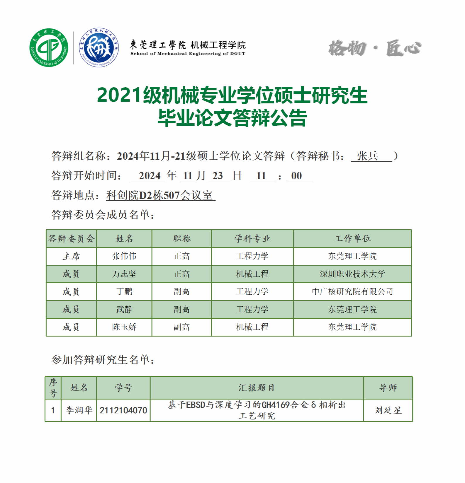 2021级机械专业学位硕士研究生12月批次毕业论文答辩公告