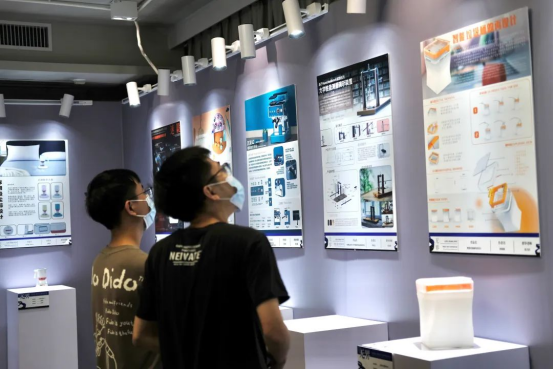 在自由参观环节,前来参观的嘉宾与员工认真观展,仔细思考作品蕴含的意义。除此之外,展览现场还设有互动区,由19级和20级工业设计专业同学绘制的几何涂鸦石膏模型也在此处展出,前来参观的嘉宾与员工均可以在此区域进行盖章、抽奖以及体验拍立得合影留念活动。参与者积极热情,现场十分热闹。