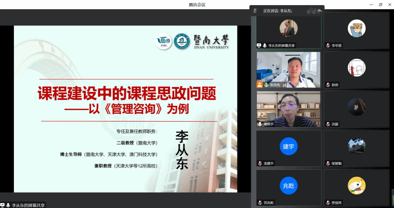 课程思政是新时代高校思想政治教育改革的重点方向。为加强课程思政建设,伟德国际1946bv官网工业工程系于10月27日开展“课程建设中的课程思政问题——以《管理咨询》为例”为主题的讲座。会议特邀了《管理咨询》国家级一流课程负责人、暨南大学李从东教授进行指导分享。本次讲座以线上的方式开展,由工业工程系主任张良伟主持,伟德国际1946bv官网副经理黄辉宇和工业工程系全体教师线上参与。李从东教授首先提出课程思政建设需依托国家教育...