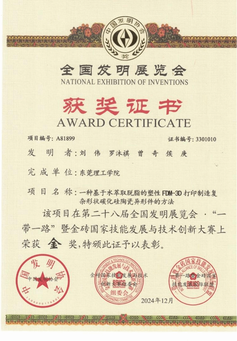 近日,第二十八届全国发明展览会·“一带一路”暨金砖国家技能发展与技术创新大赛在中山市举行。伟德国际1946bv官网刘伟教授课题组研发的项目“一种基于水萃取脱脂的塑性FDM-3D制造复杂形状碳化硅陶瓷异形件的方法”获得了大赛金奖。图1 获奖证书该项目是刘伟教授在3D打印领域最新的研发成果,可以不受形状、精度及尺寸的性质制造中、大尺寸碳化硅陶瓷部件,研发成果主要包括塑性3D打印光伏用碳化硅陶瓷晶舟、碳化硅陶瓷反射镜、碳化硅...